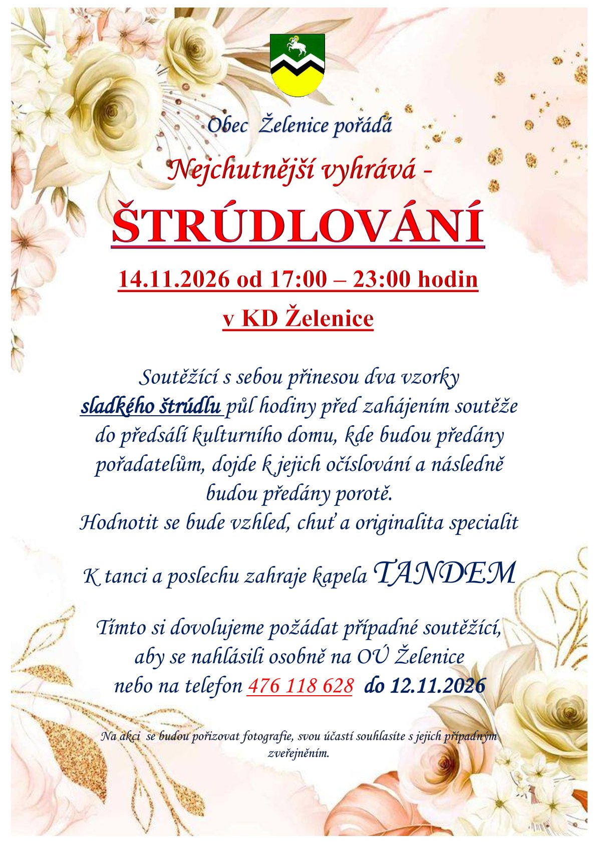 14.11.2026 od 17:00 hodin v KD Želenice Soutěž o nejchutnější sladký štrúdl Hraje kapela Tandem Vstup zdarma